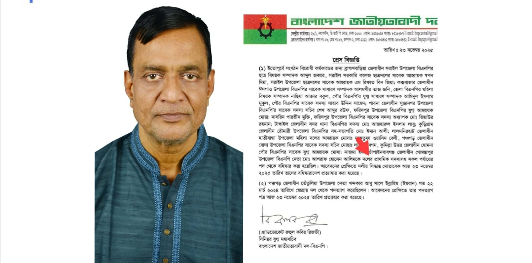 ফারুক হোসেন ডন, নাচোল (চাঁপাইনবাবগঞ্জ) প্রতিনিধি: চাঁপাইনবাবগঞ্জ জেলার গোমস্তাপুর উপজেলা পরিষদের সাবেক চেয়ারম্যান ও উপজেলা বিএনপি নেতা মোঃ আশরাফ হোসেন আলিমের বহিষ্কারাদেশ প্রত্যাহার করেছে দলটি। এর মধ্য দিয়ে তিনি আবারও দলের প্রাথমিক সদস্য পদসহ সকল পর্যায়ের পদে বহাল হলেন।রবিবার (২৩ নভেম্বর ২০২৫) বিএনপির যুগ্ম সিনিয়র মহাসচিব অ্যাডভোকেট রুহুল কবির রিজভী স্বাক্ষরিত এক বিজ্ঞপ্তিতে এই বহিষ্কারাদেশ Details..
