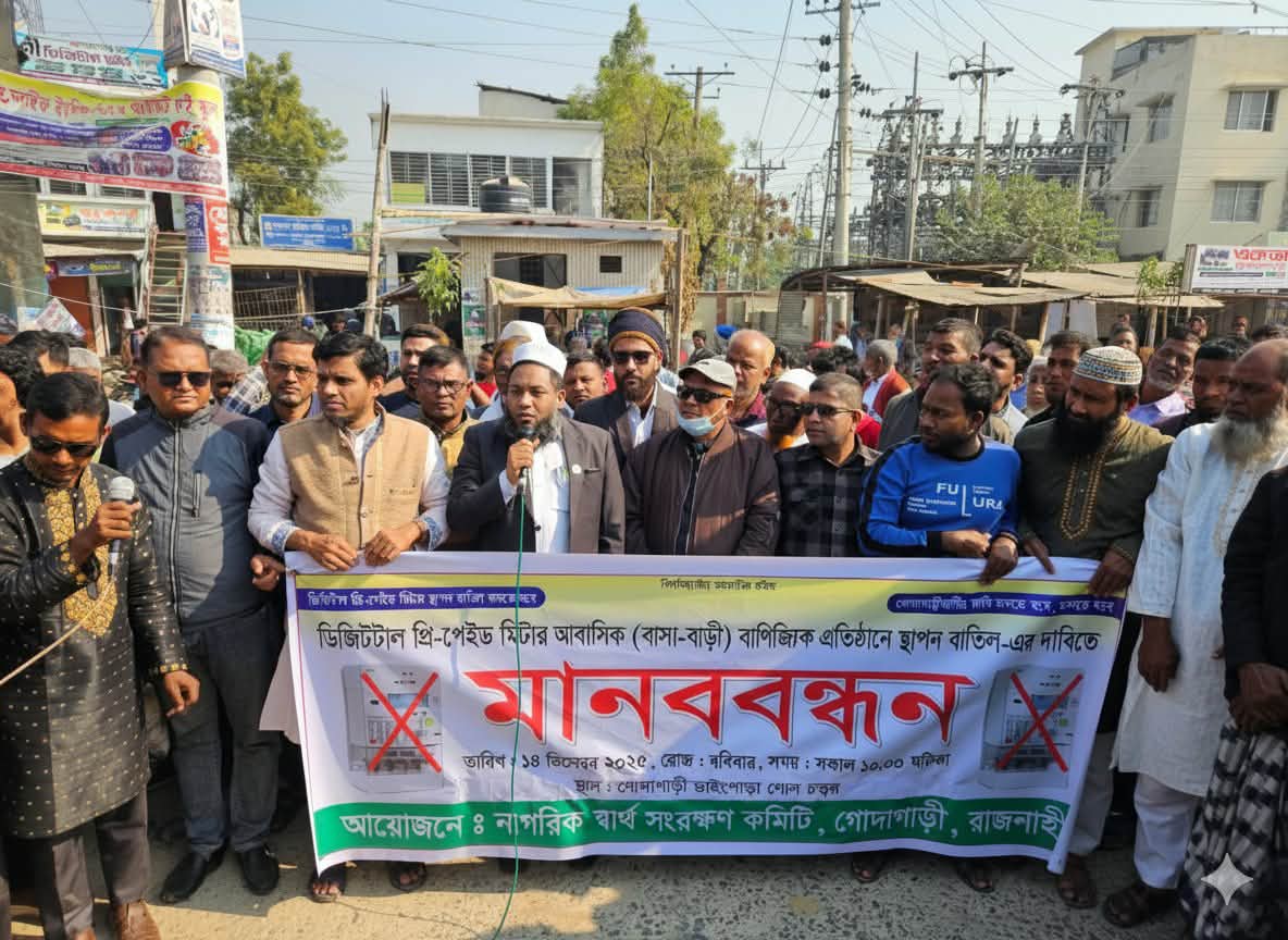 ডিজিটাল প্রিপেইড মিটার বাতিলের দাবিতে গোদাগাড়ীতে মানববন্ধন ও স্মারকলিপি প্রদান-বরেন্দ্র নিউজ