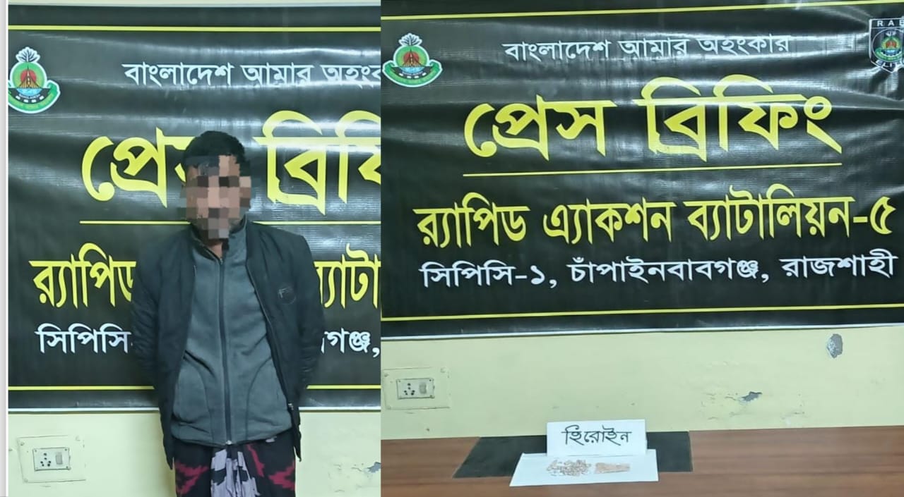 চাঁপাইনবাবগঞ্জে র্যাবের অভিযানে ১২ গ্রাম হেরোইনসহ মাদক কারবারি গ্রেফতার-বরেন্দ্র নিউজ